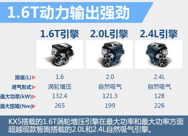 東風(fēng)悅達(dá)起亞KX5搭載的1.6T-GDI渦輪增壓發(fā)動(dòng)機(jī),這款發(fā)動(dòng)機(jī)最大功率132.4kW,最大扭矩265Nm。而現(xiàn)款智跑搭載的2.0L和2.4L自然吸氣發(fā)動(dòng)機(jī)最大功率分別為:122.3/128kW,最大扭矩則為199/226Nm。相比之下,1.6T-GDI實(shí)現(xiàn)了動(dòng)力上的全面超越,扭矩值最高超過(guò)66Nm,加速性能更加出色。此外,全新KX5傳動(dòng)系統(tǒng)方面采用7速雙離合變速器,動(dòng)力表現(xiàn)更加強(qiáng)勁,進(jìn)而大幅提升市場(chǎng)競(jìng)爭(zhēng)力。