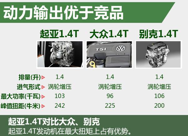 東風(fēng)悅達(dá)起亞1.4T實(shí)際上是繼2.0T、1.6T之后的第三款增壓發(fā)動機(jī),目前各大車企相繼在國內(nèi)汽車市場推出小排量增壓發(fā)動機(jī),如大眾朗逸采用的1.4T和別克昂科拉所采用的1.4T等。通過對三者相同排量的渦輪增壓發(fā)動機(jī)進(jìn)行動力對比可以發(fā)現(xiàn),起亞1.4T增壓發(fā)動機(jī)最大輸出功率超越大眾1.4T,但與別克1.4T相比仍有差距,不過最大扭矩起亞1.4T在三者中最具優(yōu)勢。