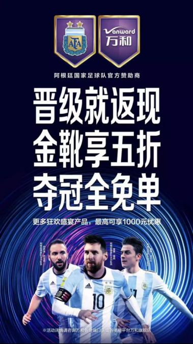 萬(wàn)和與華帝分別贊助了本屆世界杯的阿根廷隊(duì)與法國(guó)隊(duì),并先后推出了各自的營(yíng)銷(xiāo)活動(dòng)。作為阿根廷隊(duì)官方贊助商,萬(wàn)和發(fā)布了《告全體中國(guó)球迷書(shū)》,承諾“奪冠全免單”,而且還有兩大活動(dòng)配套,分別是阿根廷隊(duì)“晉級(jí)就返現(xiàn)”,球員獲得“金靴”,消費(fèi)者可以享五折。