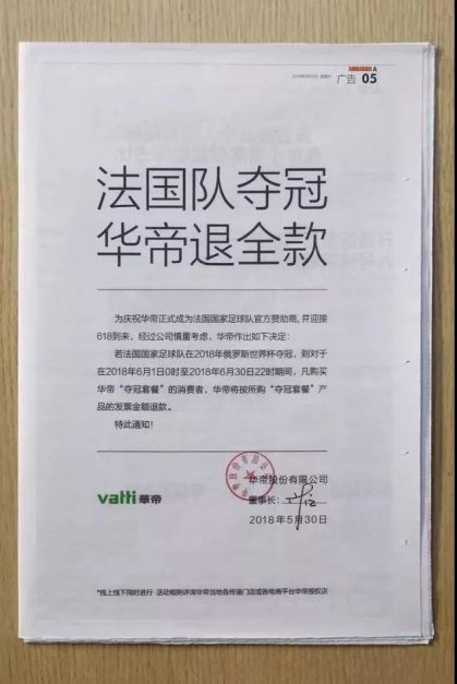 與萬(wàn)和一城之隔的華帝則承諾,如果法國(guó)隊(duì)奪冠,購(gòu)買(mǎi)“冠軍套餐”的用戶可以享受全額退款。其后,美菱、長(zhǎng)虹都推出了類(lèi)似的活動(dòng),押寶比利時(shí),舉行奪冠免單或打折的活動(dòng)。