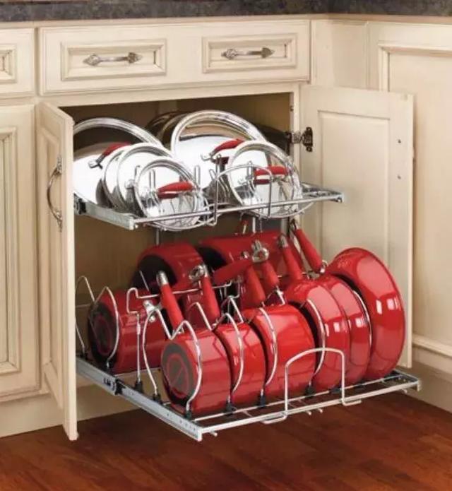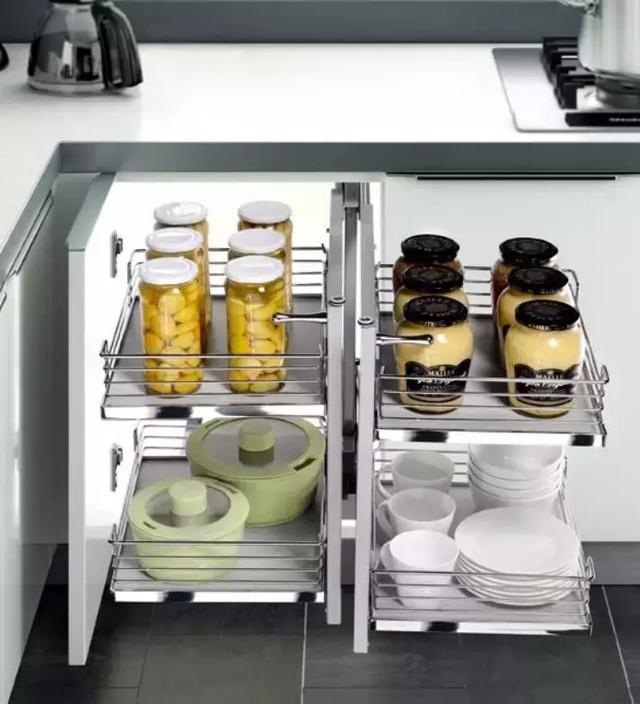 如果已經(jīng)裝修好,地柜就是一個(gè)柜門,可以在柜子里面加裝滑軌,裝上靈活的小拉籃,也能達(dá)到抽屜的效果。