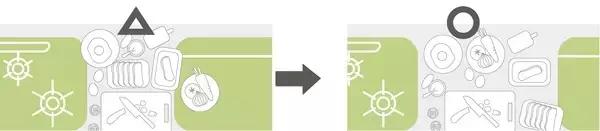 而如果換個(gè)思路,把家電的放置方法從水平排列換成垂直放置,設(shè)計(jì)一個(gè)垂直的電器柜,你會(huì)發(fā)現(xiàn),同一個(gè)區(qū)域,以前只能放一個(gè)電飯煲,現(xiàn)在卻可以放下面包機(jī)、咖啡機(jī)、攪拌機(jī)、微波爐...