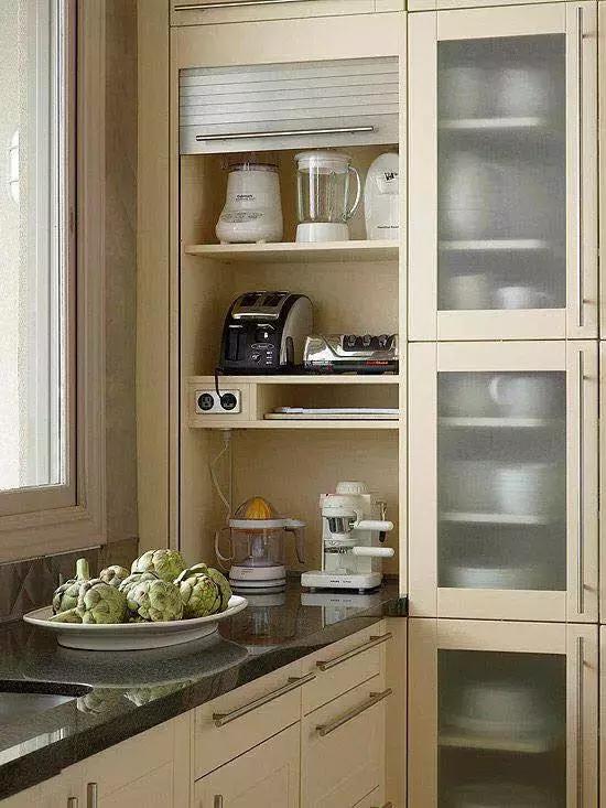 其實(shí)這些小家電占的地方都不大,只是很多人習(xí)慣與將它們一個(gè)個(gè)一字排開,所以臺(tái)面上放了電飯煲、微波爐、燒水壺之后剩下的面積已經(jīng)不夠用了。