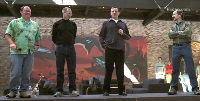 (這是當年在皮克斯中庭,艾格宣布迪士尼并購皮克斯時的珍貴影像。如今拉塞特、喬布斯、艾格、艾德同框的情景再也不會出現(xiàn),皮克斯的黃金一代已去,艾格退休后迪士尼的輝煌又會持續(xù)多久呢?)