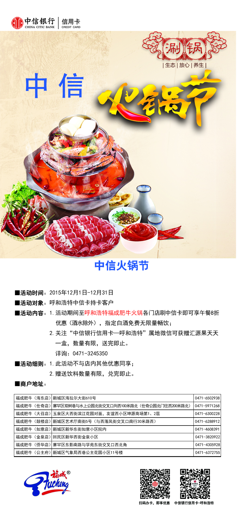 ??2015年12月1日-12月31日,為回饋呼和浩特中信卡持卡客戶,活動(dòng)期間至呼和浩特福成肥;疱伕鏖T店刷中信卡即可享午餐8折折優(yōu)惠(酒水除外),指定白酒免費(fèi)無限量暢飲;關(guān)注“中信銀行信用卡—呼和浩特”平臺(tái)微信可獲贈(zèng)匯源果天天飲料一盒。
