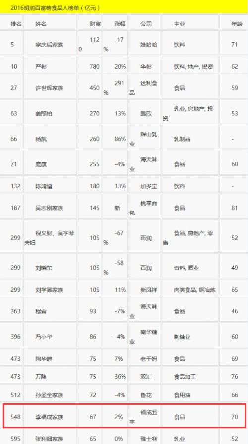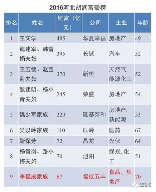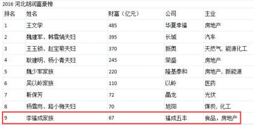 31省經(jīng)濟(jì)情報(bào)查閱的資料顯示,李福成系福成肥牛創(chuàng)始人,身家高達(dá)67億,在2016河北胡潤(rùn)富豪榜上排名第9位,在2016胡潤(rùn)百富榜食品人榜單上排名第548位。