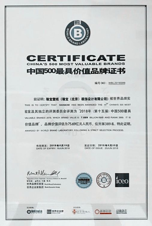 時(shí)至今日,瑞寶墻紙?jiān)谌珖?guó)已擁有近700余家門店,服務(wù)過(guò)近500萬(wàn)以上中高端家庭,憑借其良好的口碑及卓越的品質(zhì),瑞寶墻紙連續(xù)多年獲得“中國(guó)墻紙十大品牌” 稱號(hào),并于2018年6月20日,在由世界品牌實(shí)驗(yàn)室(World Brand Lab)主辦的(第十五屆)“世界品牌大會(huì)”瑞寶墻紙以(75.69億元)的品牌價(jià)值,連續(xù)8年蟬聯(lián)墻紙行業(yè)榜首。