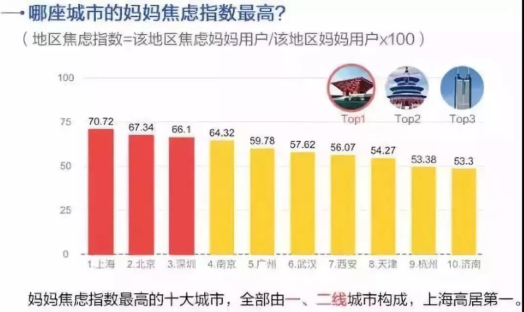 去年, UC大數(shù)據(jù)發(fā)布了國內(nèi)第一份《中國媽媽“焦慮指數(shù)”報告》,中國媽媽焦慮指數(shù)最高的十座城市中,排在第一位的就是上海,年齡上 80后媽媽是冠軍。