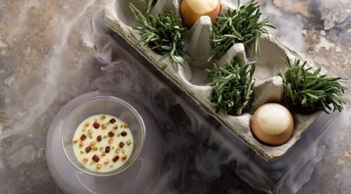 溫泉蛋是主廚Julien Royer的原創(chuàng),仙氣十足,63.3℃水溫煮55分鐘,融合蕎麥、伊比利亞火腿或菌菇,煙熏過的迷迭香在蛋白下散發(fā)出迷人的香味,也是Julien Royer的招牌名菜。