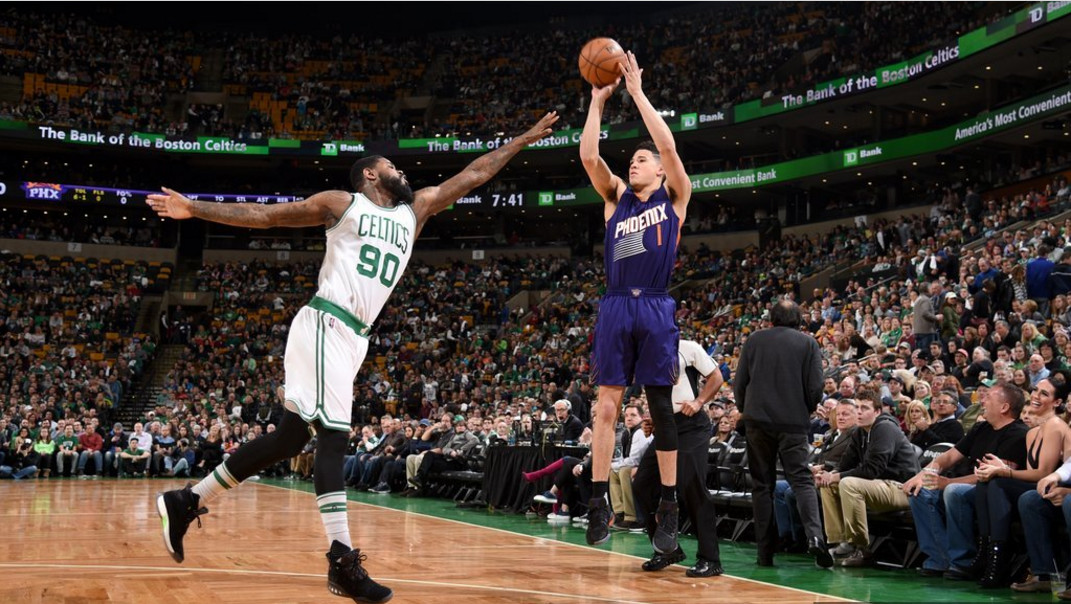 16-17賽季,太陽客場對陣防守強隊凱爾特人,雖然最終太陽輸?shù)袅吮荣悾沁@場比賽布克卻上演了一出史詩級的表演。