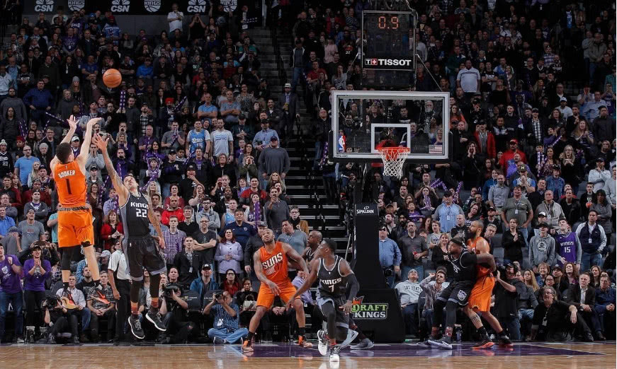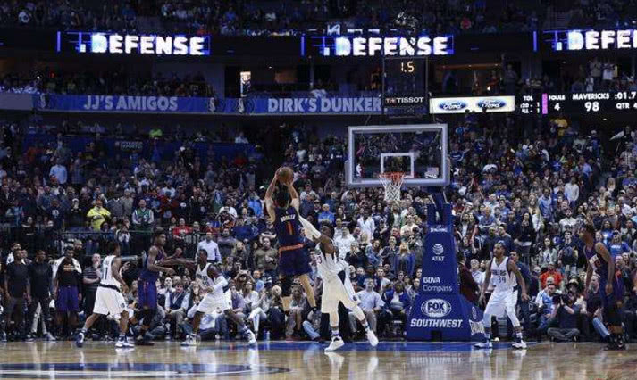 16-17賽季常規(guī)賽,太陽對上了已經(jīng)四連勝的達拉斯小牛(獨行俠),比賽進行到最后2分鐘,太陽還以92-96落后,臨危受命的布克連中三記跳投幫助球隊追到98平,最終在小牛(獨行俠)隊馬修斯三分不中后,布克一劍封喉,壓哨絕殺了比賽。