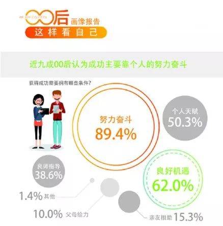 89.4%的00后認(rèn)為成功靠自己的努力奮斗,同時(shí)他們中大部分認(rèn)為良好的機(jī)遇和個(gè)人天賦很重要。而且在數(shù)據(jù)中可以看出“拼爹”的概念已經(jīng)淡出00后的觀念之中。