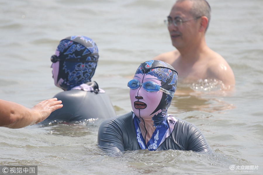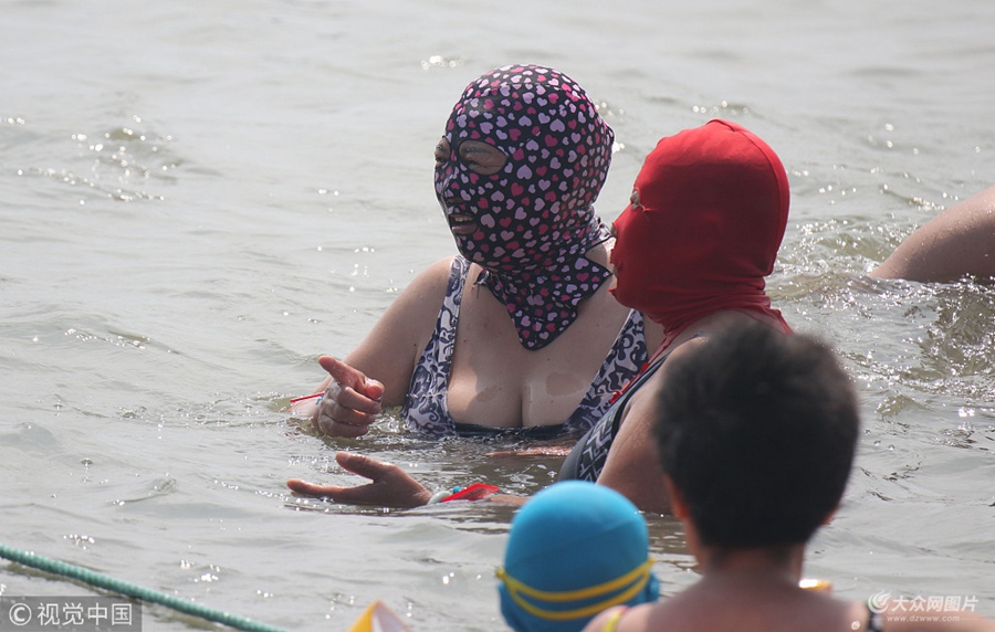 2018年7月6日,臉基尼大媽在青島第一海水浴場洗海澡。夏日炎炎,防曬神器臉基尼風靡青島海灘,眾多中老年婦女頭戴五彩繽紛的臉基尼下海游泳健身,成為一道靚麗的風景。