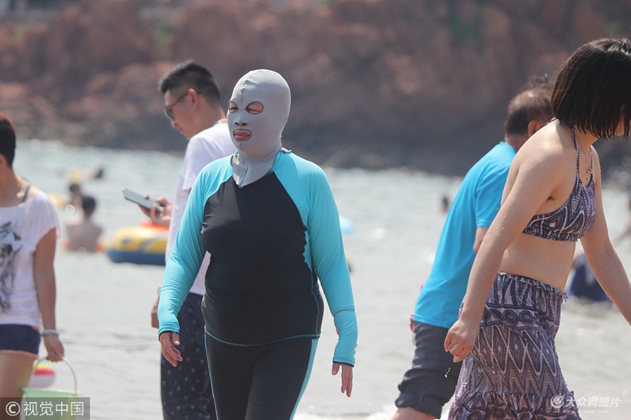 臉基尼是一種蒙面頭套,戴上后只露出眼睛和嘴鼻,既防曬又防海蜇蜇傷,物美價廉深受女泳客的喜愛。