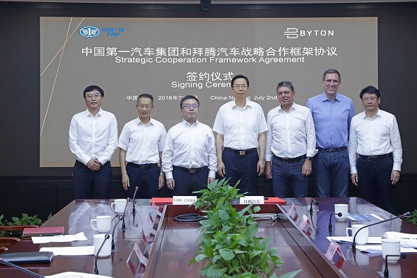 2018年7月2日,智能豪華電動(dòng)汽車(chē)企業(yè)拜騰與中國(guó)第一汽車(chē)集團(tuán)有限公司在南京簽署了戰(zhàn)略合作框架協(xié)議,雙方將充分發(fā)揮產(chǎn)業(yè)協(xié)同作用,在平臺(tái)技術(shù)、投資入股、零部件采購(gòu)等方面開(kāi)展一系列合作。