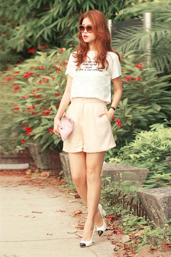 十分簡單的闊腿短褲,搭配白色的T恤,衣襟前面的字母印花,顯得很清純,很少女。腳踩尖頭高跟鞋,黑色尖頭與白色的鞋身拼接而成,鞋子上的黑白配與T恤的黑白配相呼應(yīng),顯得整體的造型是井然有序的。手拿淺色系的小包包,超級顯氣質(zhì)的!