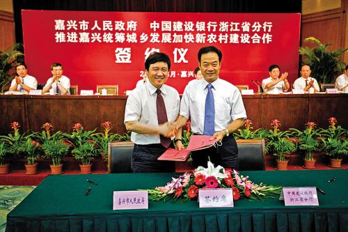 2010年6月30日,時(shí)任建行浙江省分行行長(zhǎng)余靜波和時(shí)任嘉興市市長(zhǎng)李衛(wèi)寧簽訂支持新農(nóng)村建設(shè)合作協(xié)議,3年內(nèi)向嘉興新農(nóng)村建設(shè)提供總額為150億元的信貸支持。