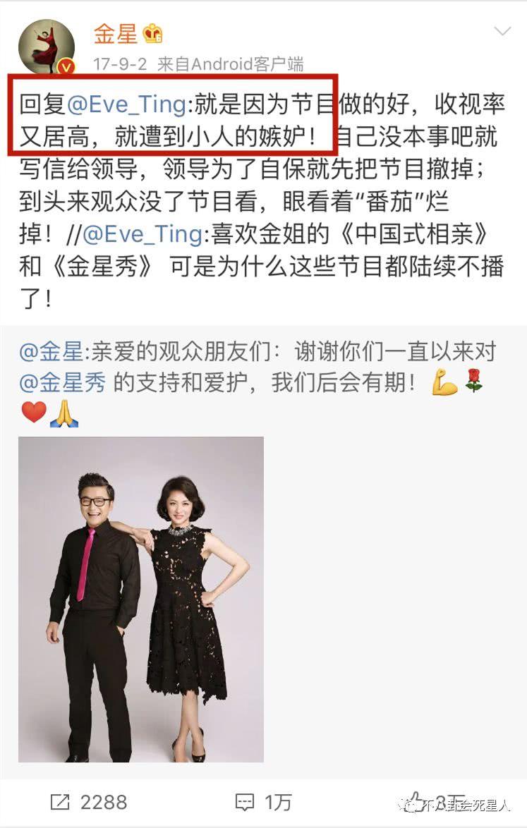 去年《金星秀》因?yàn)橐恍┰蛲2ィ鹦窃谖⒉┥瞎剂诉@一消息,并還回復(fù)了網(wǎng)友一段話,看起來意味深長,似乎是節(jié)目太火被人嫉妒,然后慘遭黑手。就目前看來,復(fù)播的希望渺茫。