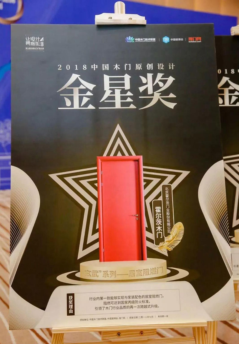 霍爾茨總經(jīng)理趙崇聯(lián)趙總參加本次會議,霍爾茨“玄武”系列居室阻燃門榮獲2018年度中國木門原創(chuàng)設(shè)計金星獎!
