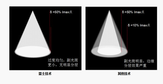 在極限角度的光強(qiáng)極大接近50%Imax(最大角度與δ\u00A0*基本對(duì)齊)。*\u00A0δ是與強(qiáng)度等于50%Imax的點(diǎn)對(duì)應(yīng)的角度,消除副光斑影響,讓過(guò)度更均勻無(wú)雜斑,從而獲得了良好的光影效果。