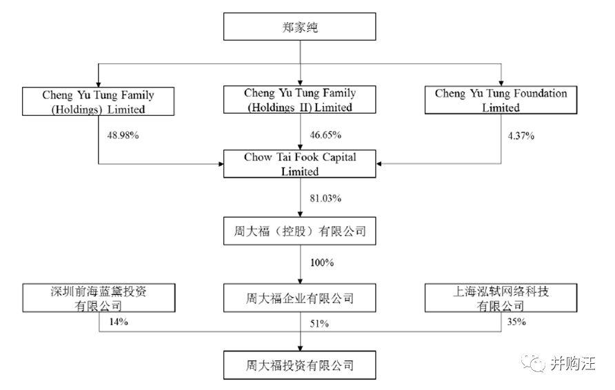 所以說此次買殼ST景谷的正是鄭裕彤家族,其具體的買殼主體搭建結(jié)構(gòu)如下。周大福投資向上穿透后,間接控股股東為Chow Tai Fook Capital Limited ,這是港股上市公司周大福的控股股東,最終實際控制人穿透后為鄭家純。