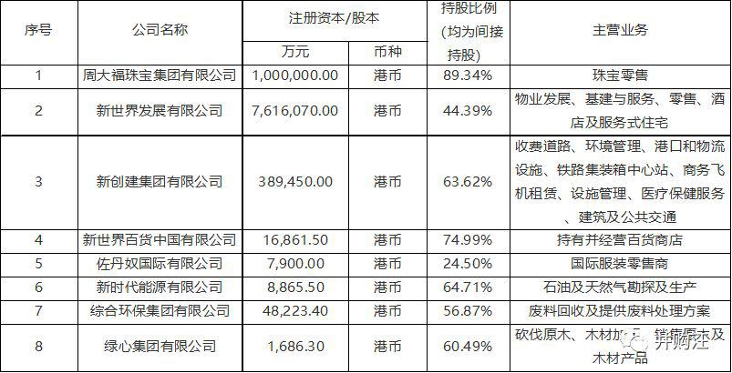 鄭裕彤家族的產(chǎn)業(yè)布局早已不僅僅局限于珠寶零售行業(yè)。在物業(yè)、基礎設施、百貨、服裝零售、油氣勘探、環(huán)保產(chǎn)業(yè)均有布局,同時也擁有對應的港股上市平臺。