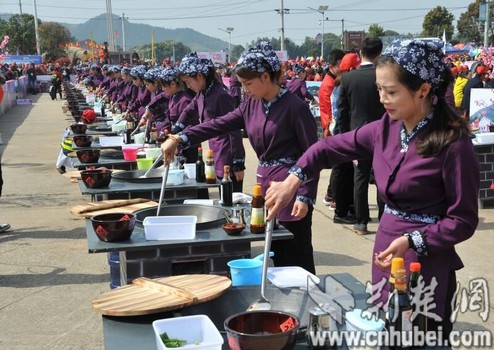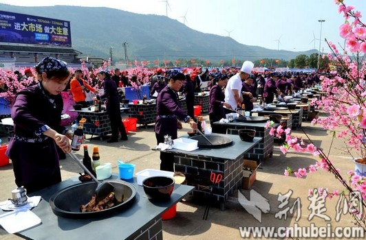 這是一場(chǎng)桃花土雞代言的農(nóng)博會(huì)。百人炒雞,千人吃雞,開(kāi)幕式現(xiàn)場(chǎng),百名桃花山本地廚娘用十道以土雞和土雞蛋為食材的桃花菜肴征服游客們的味蕾,還有桃花楠竹、楓林美酒、綠泉香稻、清水荻筍、鳳來(lái)茶油、六虎山綠茶、紅藍(lán)草莓等石首特產(chǎn)也紛紛趕來(lái)蹭熱點(diǎn)。置身青山綠水間、芬芳桃李中,美食、美景、美不勝收,游客們享眼福、飽口福,流連忘返。來(lái)自湖南華容的美女游客陶碧華說(shuō):“就是沖著這里的土雞、土雞蛋、春筍和土特產(chǎn)來(lái)的,桃花山的美食美景了不得!”