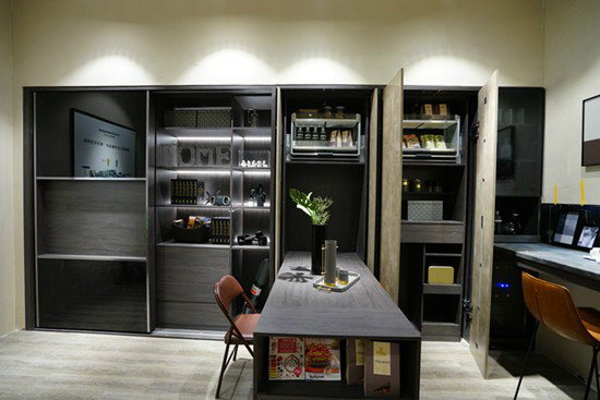【營(yíng)銷副總裁張曉午】:此次雖然只是廚衛(wèi)展,但我們采用的是櫥柜和全屋定制的呈現(xiàn)方式。而核心主題則是以這套柜子的超級(jí)收納理念,加之大部分的極簡(jiǎn)工業(yè)風(fēng)、新中式模式來(lái)呈現(xiàn),整體來(lái)講,這里面貫穿的都是2018年的新品。