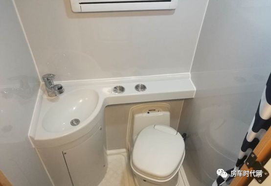 正對(duì)門口的是衛(wèi)生間。衛(wèi)生間里有一體式淋浴衛(wèi)生間系統(tǒng)、洗手臺(tái)盆、毛巾架、梳妝鏡和便攜式馬桶等。衛(wèi)生間旁邊是一個(gè)到車頂?shù)墓褡樱褡又虚g裝有一臺(tái)冰箱。除了這臺(tái)冰箱之外,還可以多選裝一臺(tái)冰箱。兩臺(tái)冰箱加在一起的容量大概在100L。另外,這輛車的凈水箱為75L,污水箱為45L。
