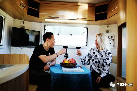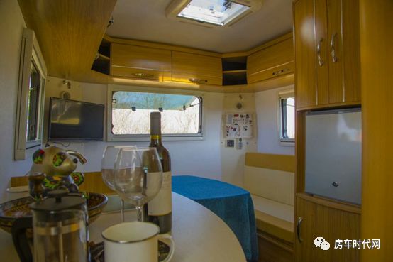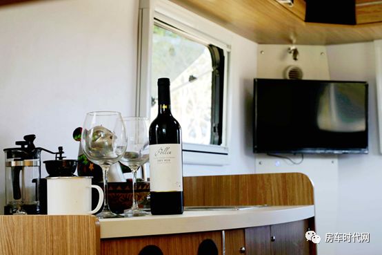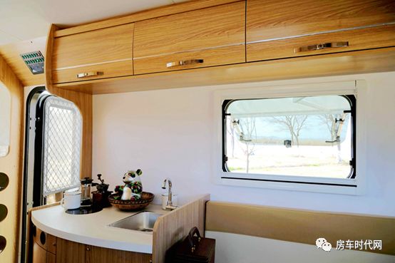 到了車尾就是一個(gè)環(huán)形卡座沙發(fā)了。沙發(fā)三面都可以坐人,三五好友,一瓶美酒,小酌一番,小憩一下,太美妙了。中間的桌子是可升降的,所以只要把它降下去,就得到了一張雙人床,晚上可以高枕無憂啦。車尾的墻壁上同樣開了一個(gè)大大的窗戶,可向外推開它,清風(fēng)徐來。窗戶旁邊掛著一臺(tái)24寸的車載電視。同樣地,吊柜環(huán)繞三面,儲(chǔ)物空間真是太豐富了。