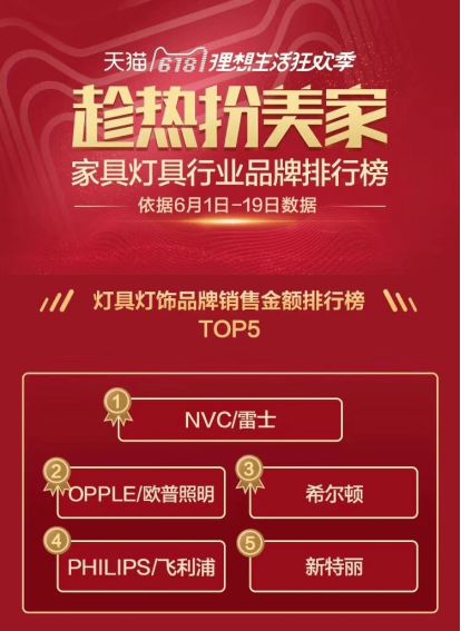 天貓618燈具燈飾品牌銷售金額排行榜