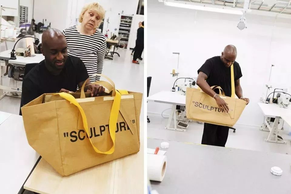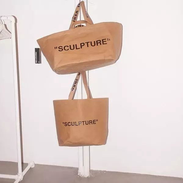 他的個(gè)人品牌off white也是一大潮牌,去年就和宜家推出了合作款。比如SCULPTURE棕色購物袋。