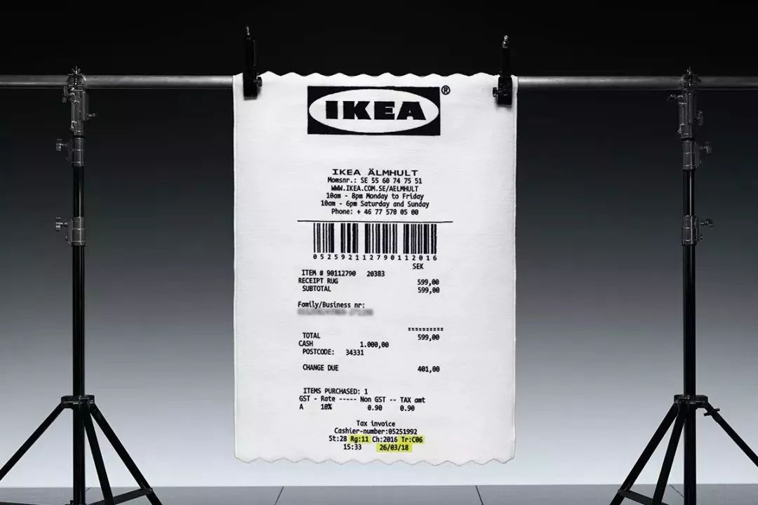 比如這塊宜家收銀小票地毯,還是很別致的。上面的26/03/2018,是這個(gè)地毯第一個(gè)樣品的生產(chǎn)日期。