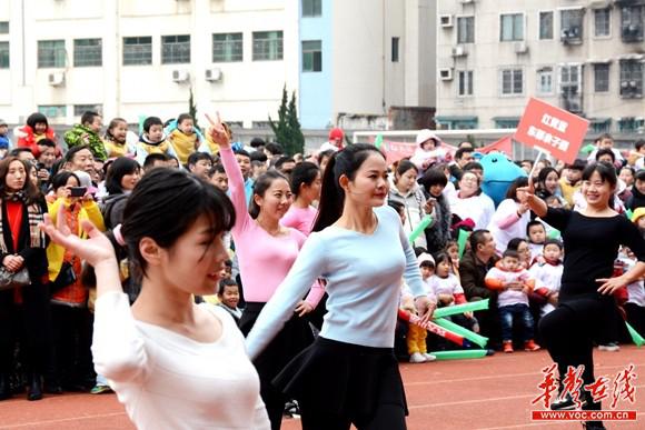 親子運動會上,紅黃藍(lán)幼兒園老師帶來開場舞表演。