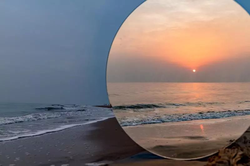 海邊的黃昏,余暉投射到沙灘上的鏡子里……