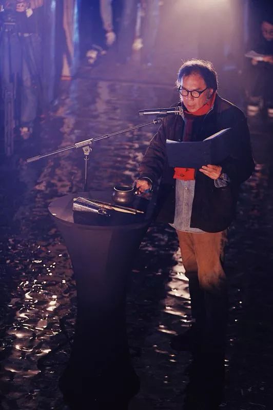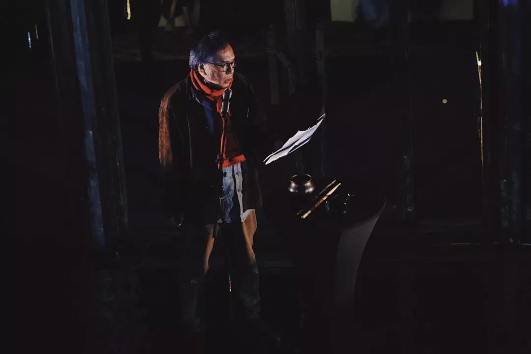 在詩人朗讀的間隙,他用杵敲擊銅缽發(fā)出純粹的金屬音,彷佛抓住詩歌的語言,熔鑄成刀,直抵人心。
