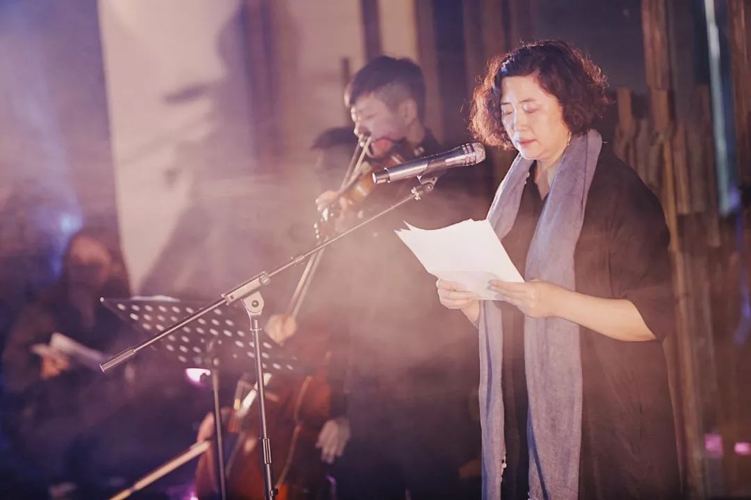 女性詩人藍(lán)藍(lán)正在大提琴和小提琴的伴奏下朗讀詩歌