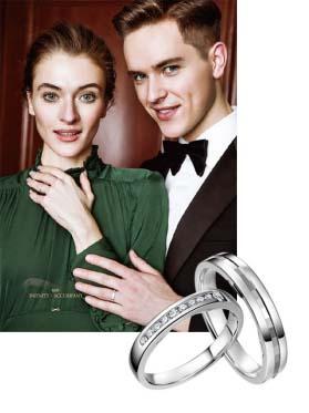 創(chuàng)意說明:設(shè)計師將鏤空的“∞”無限符號設(shè)計巧妙地藏于戒面底部,使踐行諾言、守護愛情的真心凝鑄成永恒。象征對至臻愛人的永生庇佑。女戒鑲10顆明亮式切割的圓鉆,寓意婚姻的十全十美,男戒則以CNC數(shù)控電腦精密車花工藝,剛毅中不失優(yōu)雅。\u00A0\u00A0\u00A0\u00A0\u00A0\u00A0\u00A0\u00A0