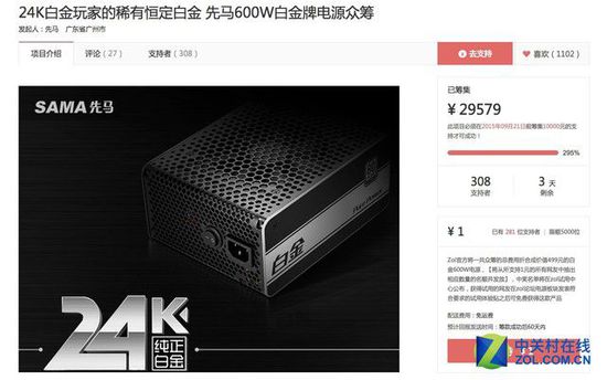 現(xiàn)在先馬白金600W電源正在中關(guān)村舉辦眾籌活動,獲得不少玩家的關(guān)注,并在短短不到一個月的眾籌時間里取得不俗的成績。原定計劃眾籌10000元,目前已實際眾籌到29579元,超額完成任務(wù)。其中,399元檔位的眾籌早被搶購一空,現(xiàn)在還有1元、429元及4999元三個檔位。眾籌活動將在9月21號結(jié)束,對這款電源感興趣的玩家可要抓緊時間了。