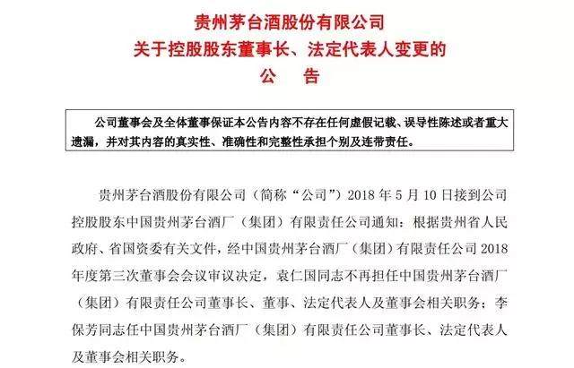 2018年5月10日晚間,貴州茅臺還發(fā)布了關于控股股東董事長、法定代表人變更的公告。