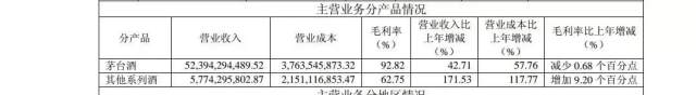 數(shù)據顯示,2017年貴州茅臺茅臺酒營收約為523.94億元,約占總營收的90%,同比增長42.71%;其毛利率雖同比降低0.68%,但仍高達92.82%。