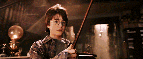 是小哈利第一次在對(duì)角巷舉起魔杖時(shí)激動(dòng)的表情