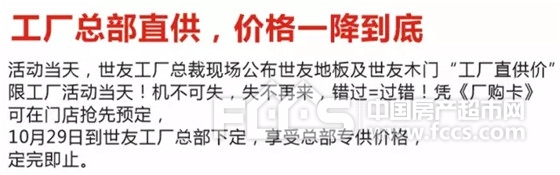 相關(guān)資訊: 崇尚環(huán)保,追求品質(zhì),世友地板可以經(jīng)得起考驗(yàn) 強(qiáng)者合璧!世友與保利地產(chǎn)達(dá)成長期戰(zhàn)略合作 【注意】您有一把價(jià)值488元實(shí)木仿古椅待領(lǐng)取