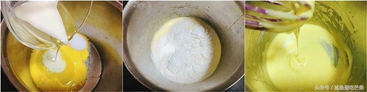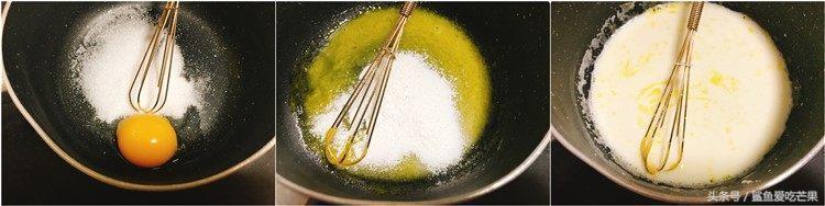 5. 蛋黃中加入糖拌勻,加入牛奶和油 充分拌勻