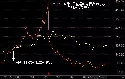 很多投資者對上一次超越貴州茅臺股價的全通教育印象深刻。全通教育在今年2月17日漲停,收報184.77元,超過貴州茅臺的182.22元,成為A股第一高價股。當(dāng)天滬指收報3246點,此后的4個月內(nèi),上證指數(shù)漲幅近60%,直到6月15日摸高5178點。