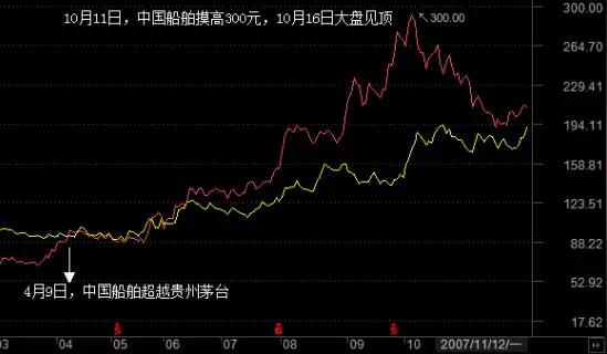再往前看,2007年的大牛市,中國船舶也曾超越貴州茅臺成為兩市第一高價股。2007年4月9日,中國船舶同樣以漲停的方式收報99.67元,超越貴州茅臺的95元。當(dāng)天上證指數(shù)收報3398點,此后半年多時間,滬指繼續(xù)上漲了80%,直到10月16日摸高6124點。