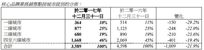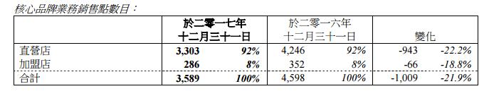 于回顧年內(nèi),集團開始調(diào)整其渠道組合,以配合其全新品牌形象并繼續(xù)進行店鋪整合,這些舉措導(dǎo)致2017全年凈關(guān)閉1,009個銷售點(包括943家直營店和66家加盟店)。于2017年12年31日,其核心品牌業(yè)務(wù)擁有3,589個銷售點(包括3,303家直營店和286家加盟店),較2016年12月31日的4,598個銷售點減少21.9%。