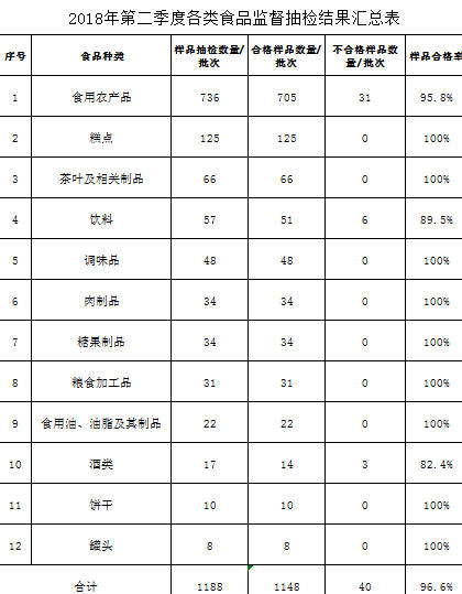 7月10日,海南省食品藥品監(jiān)督管理局公布了關(guān)于2018年第二季度公告的食品安全監(jiān)督抽檢結(jié)果。檢驗(yàn)項(xiàng)目合格的樣品1148批次,不合格樣品40批次,樣品總體合格率為96.6%。抽檢信息顯示,不合格食品主要為食用農(nóng)產(chǎn)品、飲料和酒類;其中食用農(nóng)產(chǎn)品是重災(zāi)區(qū),不合格31批次,另外,不合格飲料6批次,不合格酒類3批次。此次抽檢的具體信息: