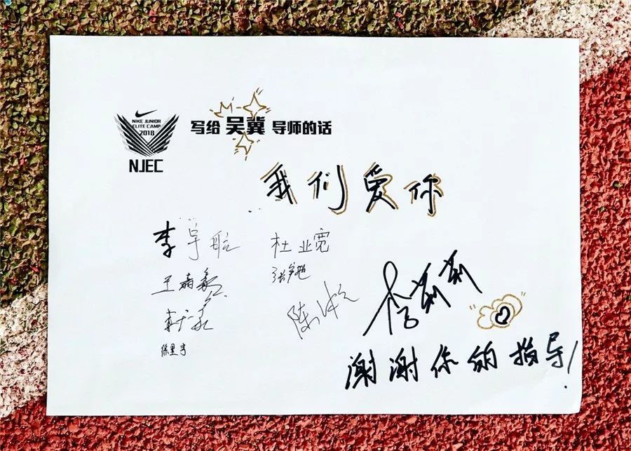 在營期間,每組運(yùn)動(dòng)員們還通過一句話表達(dá)了對(duì)導(dǎo)師特訓(xùn)的感謝,并且認(rèn)真簽名,這份愛,激勵(lì)著彼此追逐田徑美好的明天!