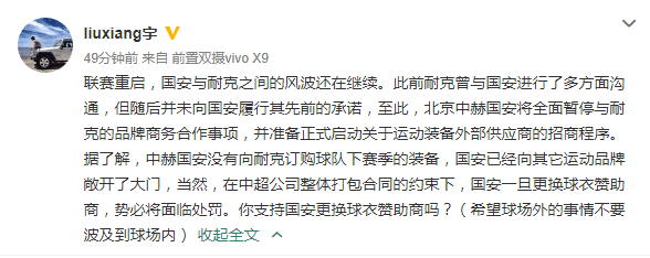 劉翔宇在微博寫道:“聯(lián)賽重啟,國(guó)安與耐克之間的風(fēng)波還在繼續(xù)。此前耐克曾與國(guó)安進(jìn)行了多方面溝通,但隨后并未向國(guó)安履行其先前的承諾,至此,北京中赫國(guó)安將全面暫停與耐克的品牌商務(wù)合作事項(xiàng),并準(zhǔn)備正式啟動(dòng)關(guān)于運(yùn)動(dòng)裝備外部供應(yīng)商的招商程序。